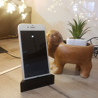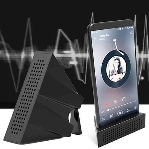papildus skaļuma palielināšanai šis parocīgais sīkrīks darbojas arī kā mobilā tālruņa turētājs.